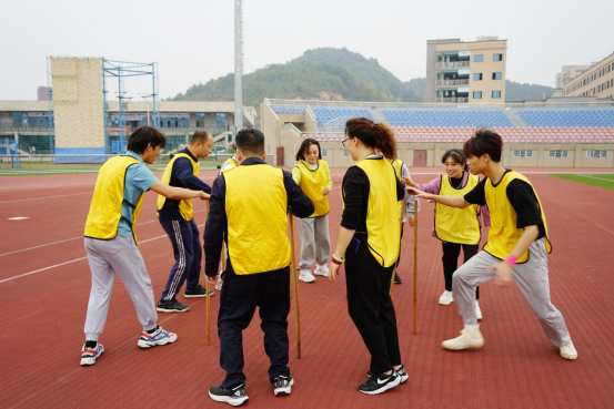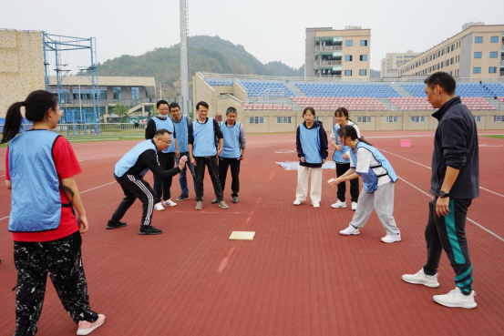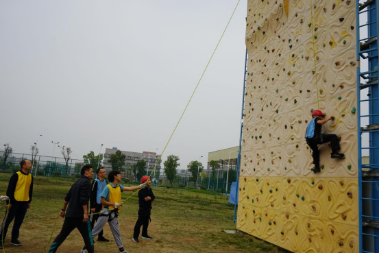 集中学习结束后,在beat365官网登录中文张迎春老师的带领下,全体党员在南区运动场参与同心鼓、围板凳、高山流水及攀岩等体育拓展活动。