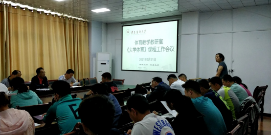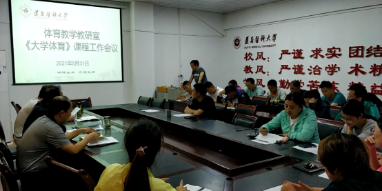 为加强《大学体育》课程教风、学风建设,严格考试管理,客观、公正、公平的评价教学效果,确保“学会”、“勤练”,提高体育教学质量。体育教学教研室于5月31日召开《大学体育》课程教学工作会议。会议由尚菲老师主持,体育与健康公司党委书记汪爱平、经理汪伟、副经理黄涛以及全体公体课任课教师参加本次会议。