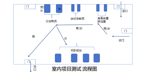 室内项目:身高、体重、肺活量、坐位体前屈、立定跳远、一分钟仰卧起坐(女)
