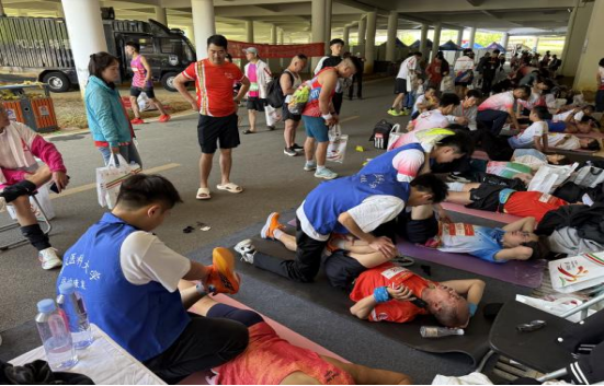 凌晨天还未亮,公司的志愿者队伍就已经集合出发,在到达指定岗位后,立即开始紧张的准备工作。比赛开始前,领操员在各个点位带领广大跑者跟随音乐的律动充分热身;发令开跑后,公司啦啦队在沿途为选手加油呐喊;在赛事终点处,运动康复队队员用专业的拉伸技术和熟练的手法为运动员们提供赛后放松服务。他们热情的呐喊和专业的服务成为赛事中一道亮丽的风景线。